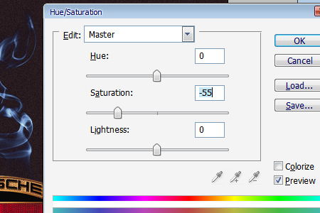 Сейчас немного убавим насыщенности нашего дыма, для этого необходимо применить модификатор Hue/Saturation (Ctrl+U) и выставим параметр Saturation на -55: