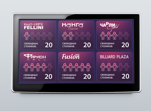 ЖК-панель в фойе заведения, отображающая количество свободных столиков в барах.